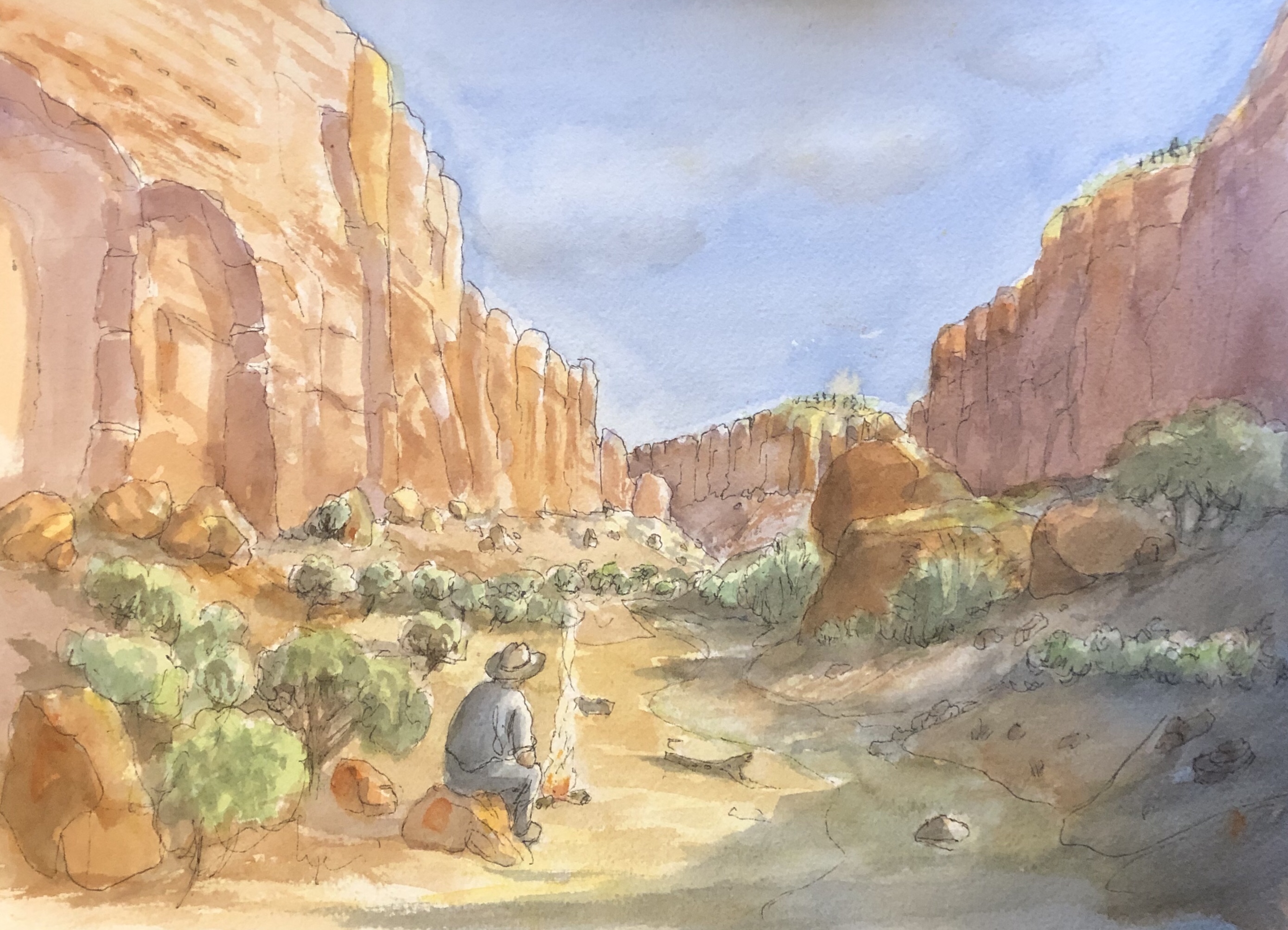 Watercolor painting of a campfire in the late afternoon in Utah’s canyonlands. 11×17 on paper