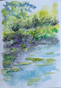 Camping in the Michigan woods, I found myself under the canopy of towering trees. I took the opportunity to sketch, incorporating more green than I typically use.