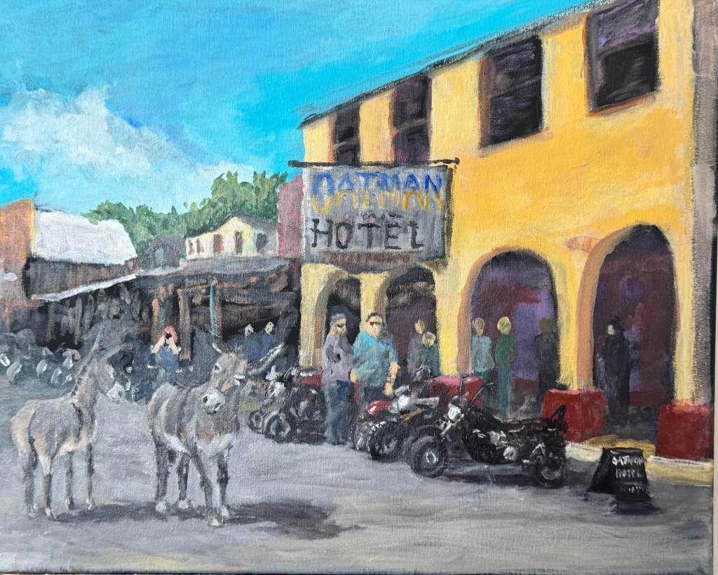 I am working on a painting of the oatman hotel I have a few corrections to make but I am pleased with the composition so far. I’ve improved the donkeys. This is a stop on Route 66. Lots of cycle clubs.