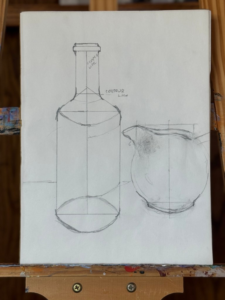 Drawing lessons again. Here I have used construction lines and shapes to draw cylinders spheres and triangles. The used contour lines to round the shapes edges. My eraser smudges. Lesson to smudge in a context line. Context are small marks or lines to convey volume.