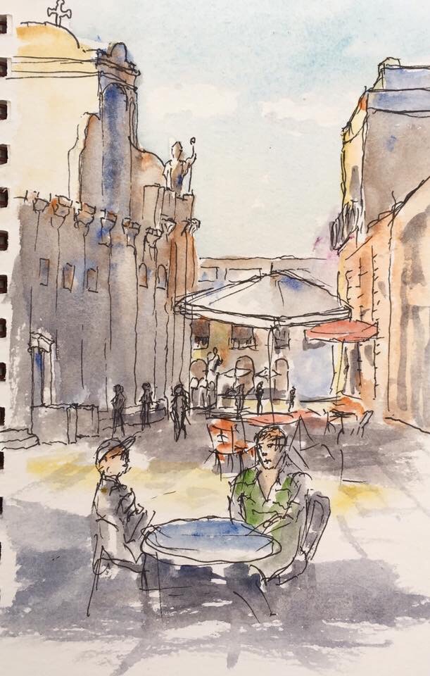 I enjoy capturing the scenes around me with ink and watercolor sketches. Sitting alone in a cafe with a drink, observing and documenting what I see or feel, each sketch becomes an artistic memory.